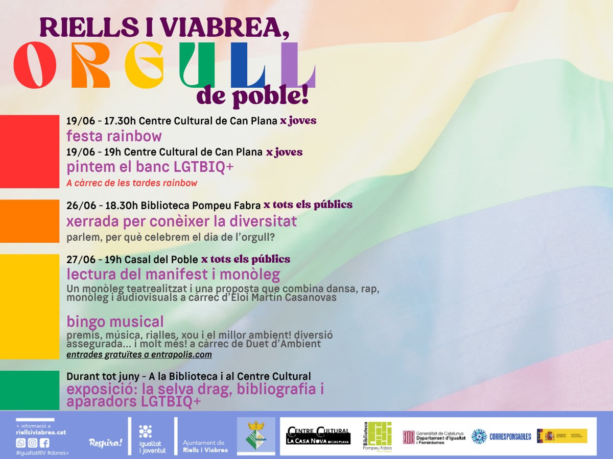 19 de juny - 17:30 h - Festa Rainbow 19 de juny - 19 h - Pintem el banc LGTBIQ+ 26 de juny - 18:30 h - Xerrada per conèixer la diversitat "parlem, per què celebrem el dia de l'orgull?" 27 de juny - 19 h - Lectura del manifest i monòleg. Un monòleg teatralitzat i una proposta que combina dansa, rap, monòleg i audiovisuals a càrrec d'Eloi Martín Casanovas. Bingo musical: Premis, música, rialles, xou i el millor ambient! Diversió assegurada... i molt més! A càrrec de Duet d'Ambient. Durant tot el juny exposició La seva Drag, bibliografia i aparadors LGTBIQ+